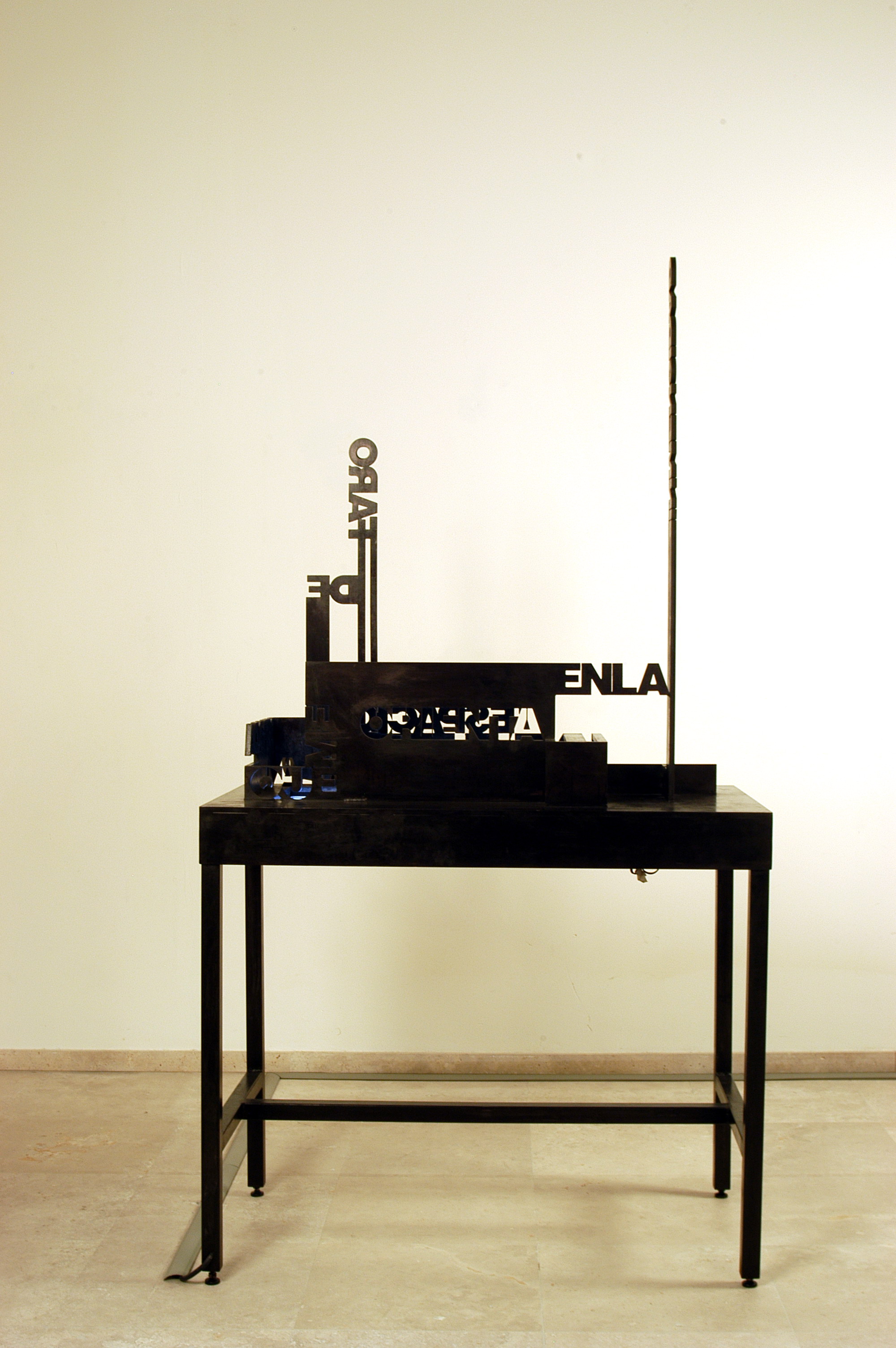 Escultura de hierro y acero inoxidable. Pantalla de vídeo. Reproductor DVD